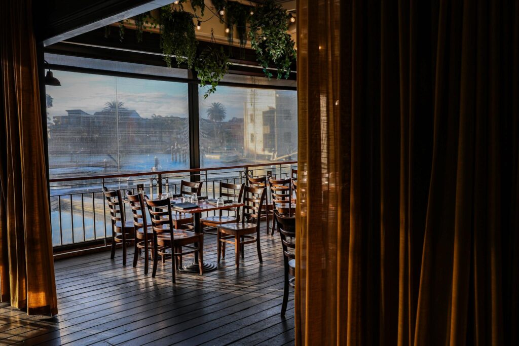 Bathed in golden hour light and boasting uninterrupted views of the marina, The Alcove Deck is a stunning semi private space perfect for relaxed, sun soaked celebrations or elegant evening gatherings. With sheer curtains that offer soft separation from the rest of the venue, the space feels tucked away while still being open and airy.